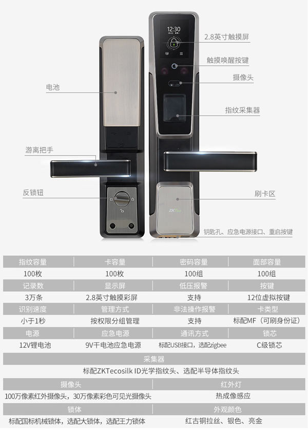 商品名稱:中控智慧(ZKTeco)ZM100指紋鎖電子鎖智能門鎖密碼鎖防盜門鎖家用 亮金色 標(biāo)配