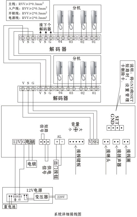 1. 系統(tǒng)采用總線制布線,必須增加解碼器,主干線為三芯線,入戶(hù)線為兩芯線無(wú)極性區(qū)分,布線簡(jiǎn)單、施工方便;