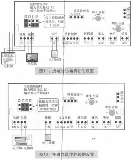 主機(jī)主板上的"K1-K4"插針(如圖10所示)是設(shè)置開(kāi)鎖信號(hào)的,出廠時(shí)主機(jī)默認(rèn)是接普通電鎖的(默認(rèn)是短接K1,如圖11所示),如果使用磁力鎖或電插鎖,那么把插針帽換插到"K2"和"K3"插針的位置(即短接"K2"和"K3"插針,如圖12所示),如果需要輸出低電平信號(hào),那么短接"K4"插針即可.