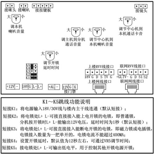 注:主機(jī)默認(rèn)是接電控鎖,如果是接磁力鎖,須把K2插帽拔掉,然后短接K3 和K4插帽,這樣是通過調(diào)節(jié)VR5來設(shè)置開鎖時(shí)間,也可以只短接K3,然后通過在主機(jī)上輸入#00002002+XX來設(shè)置開鎖時(shí)間。
