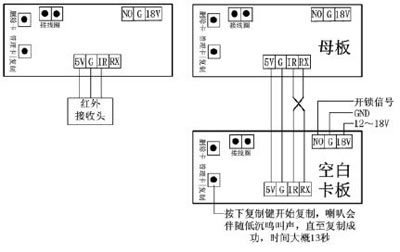 5、數(shù)據(jù)復(fù)制:一條4P對4P的線把2個(gè)刷卡板連接在起來,如下圖所示。在空白板刷卡板上供電,供電后按一下空白刷卡板上的復(fù)制按鍵,聽到喇叭響約13秒后停止,數(shù)據(jù)即復(fù)制成功,這時(shí)2個(gè)刷卡板的卡數(shù)據(jù)相同。在多門口要求卡相同可以快速復(fù)制而不用每臺主機(jī)都用管理卡增加;